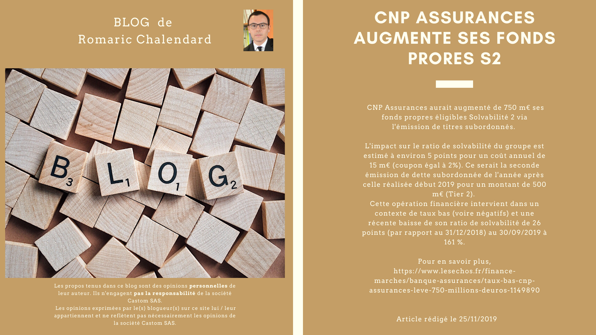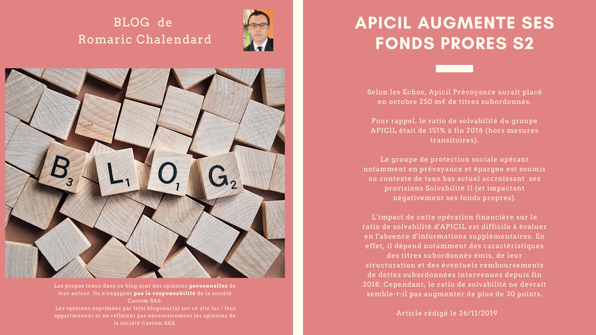 Enfin, l'Autorité de Contrôle Prudentiel et de Résolution supervise les organismes d'assurance français. Elle s'assure notamment du respect par ces organismes d'assurance des exigences prudentielles règlementaires (Solvabilité II) garantissant une gouvernance adéquate et un haut niveau de sécurité financière (VaR 99,5%). Les activités menées par Castom ne visent évidemment nullement à remettre en question ses missions ni ses décisions.
