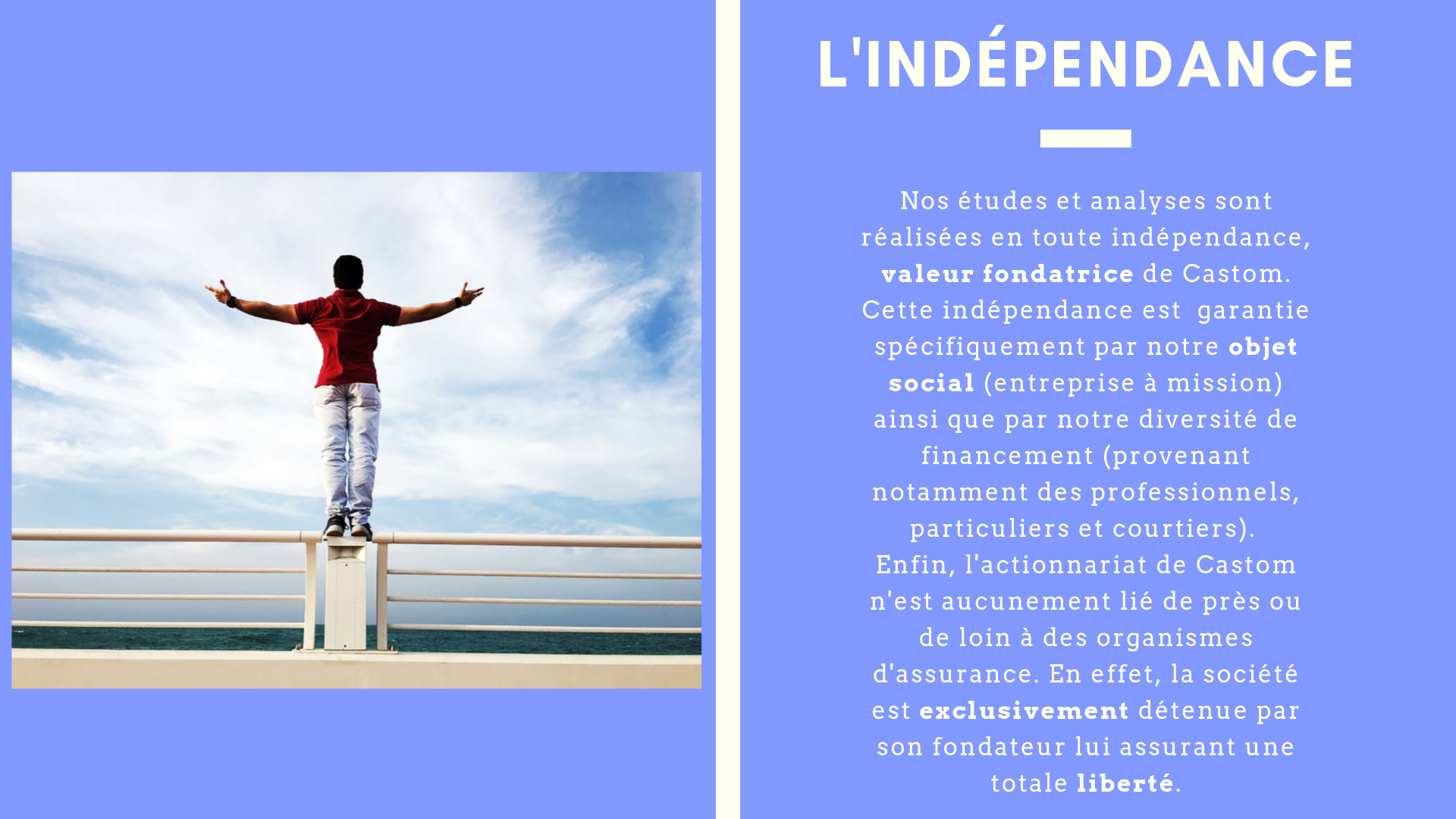 Castom ne pourrait être tenue responsable de toute décision ou stratégie d’investissement fondée sur une information mentionnée sur le site. L'appréciation fournie par Castom ne pourra pas être interprétée comme un substitut ou une limite aux analyses éventuelles effectuées par les conseils en assurance dans le cadre de leurs projets.